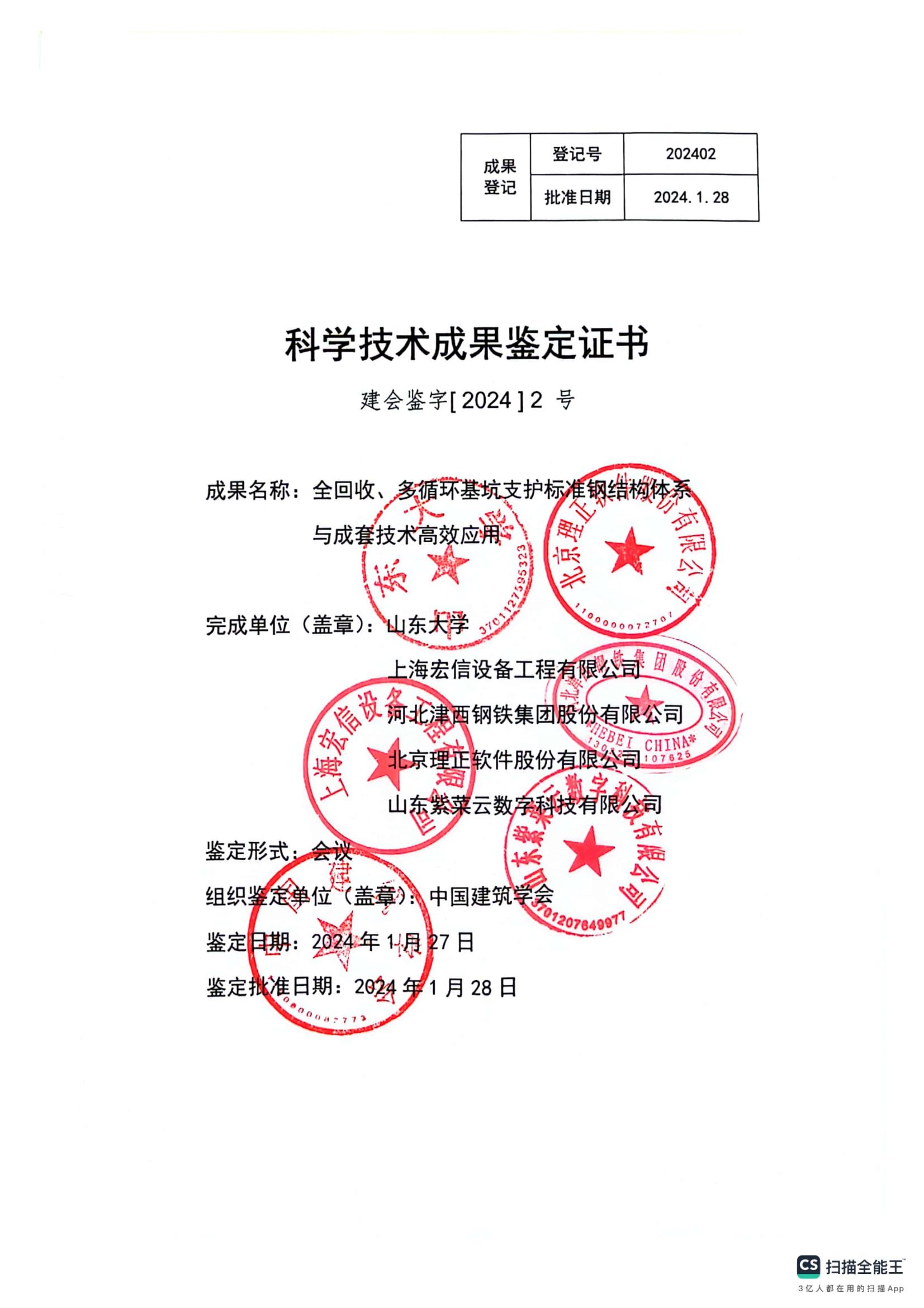 2024年1月27日,中國建筑學(xué)會組織專家在北京召開了“全回收、多循環(huán)基坑支護(hù)標(biāo)準(zhǔn)鋼結(jié)構(gòu)體系與成套技術(shù)高效應(yīng)用”線上線下相結(jié)合的科技成果鑒定會。 該項目由山東大學(xué)、上海宏信設(shè)備工程有限公司、河北津西鋼鐵集團(tuán)股份有限公司、北京理正軟件股份有限公司、山東紫菜云數(shù)字科技有限公司5家單位共同完成。